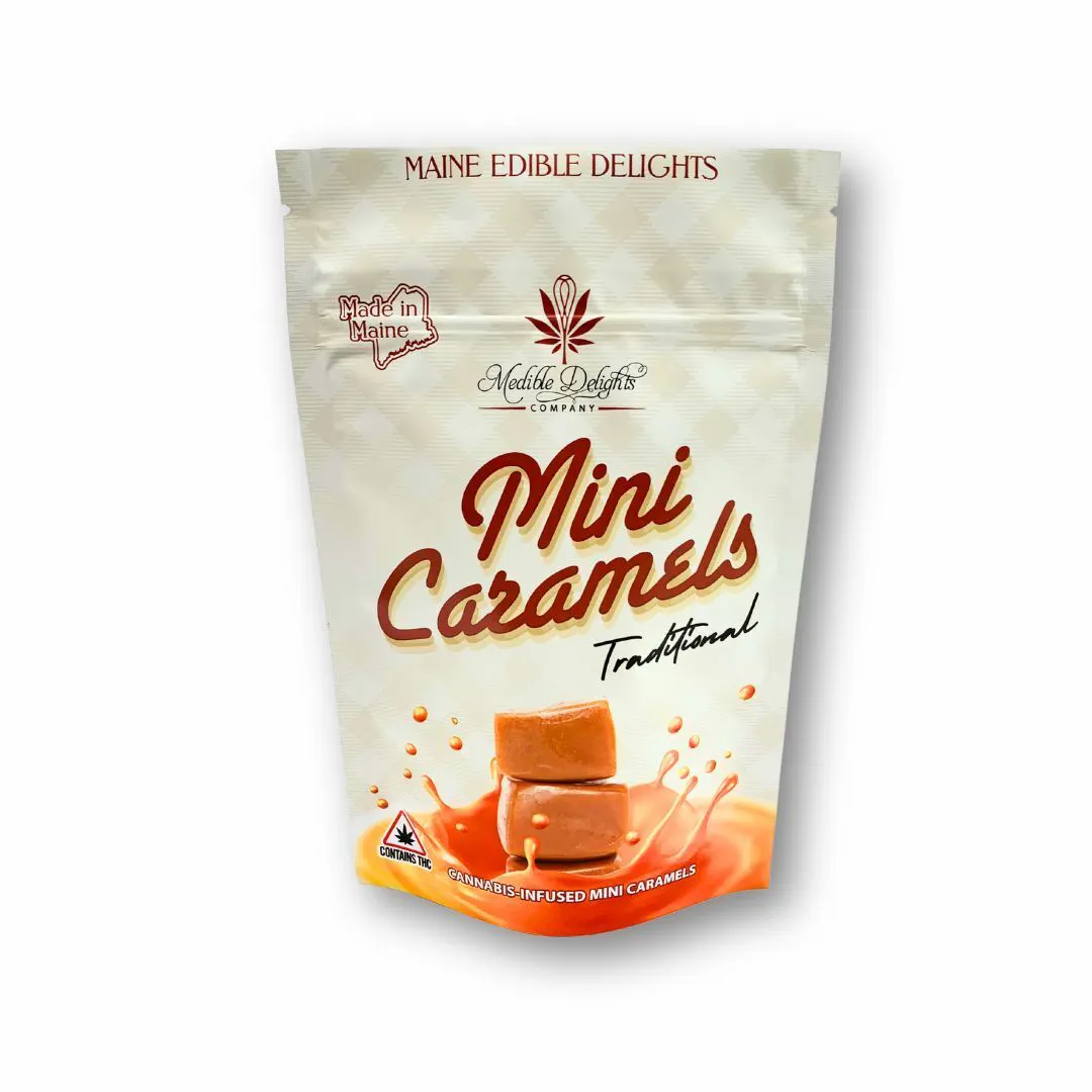 New Mini Caramels! Handmade in Maine and infused with strain specific MOFGA certified clean cannabis. enjoy as is, in hot coffee, or melted into ice cream! strain specific indica infused. 10mg / 10 pack Gluten Free. 21+ only.
